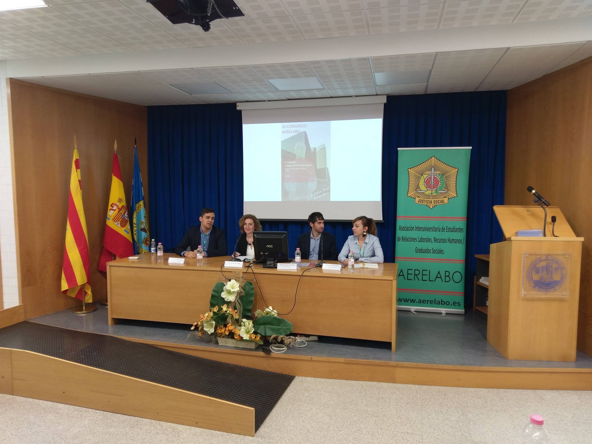 La inauguración oficial tuvo lugar el jueves 19 de octubre en el Aula Magna de la FCCSST. Fue presidida por la Decana Ruth Vallejo Dacosta y durante la misma intervinieron la Directora General de Trabajo del Gobierno de Aragón, Dña. Soledad de la Puente, D. David Oroz Alquézar, presidente del Excelentísimo e Ilustrísimo Colegio de Graduados Sociales de Aragón, la presidenta de AERELABO, Dña. Silvia Peña Maestro y el presidente del comité organizador del congreso, D. Juan Cruz Viamonte.